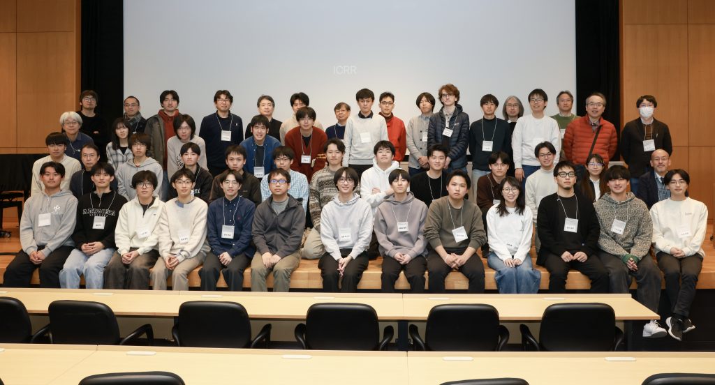 宇宙線研究所で研究生活を送る大学院生が、お互いの研究内容を知り、交流を深めるための修士・博士研究発表会が2月20日、開催されました。修士・博士論文が完成を迎えるこの時期に毎年開かれており、今回で15回目となります。会場は柏キャンパス内の柏図書館メディアホールで、オンサイトとZoomによるオンラインのハイブリッド開催となりました。