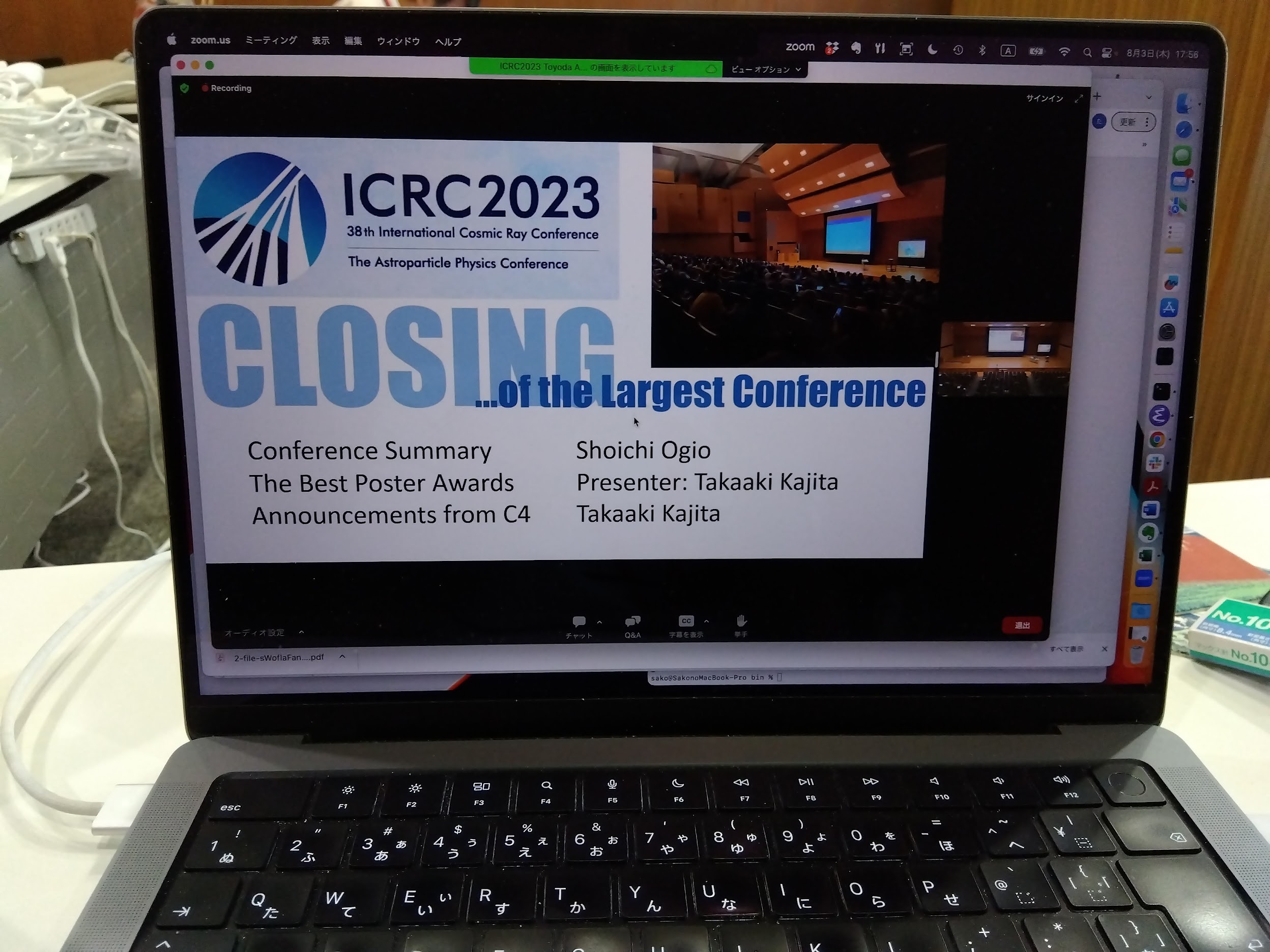 研究発表は「Mega ALPACA計画」と「COSMOS X」のポスター発表をして、どちらも最終日のまとめ講演(ラポーター講演)で紹介されましたよ。TAグループはTAx4の最初のエネルギースペクトルを発表、ALPACAグループはALPAQUITA地上検出器の初期結果としてきれいな月の影を報告しました。LHCfグループも、初の超前方イータ中間子の生成断面積を報告。研究の紹介もしないと。